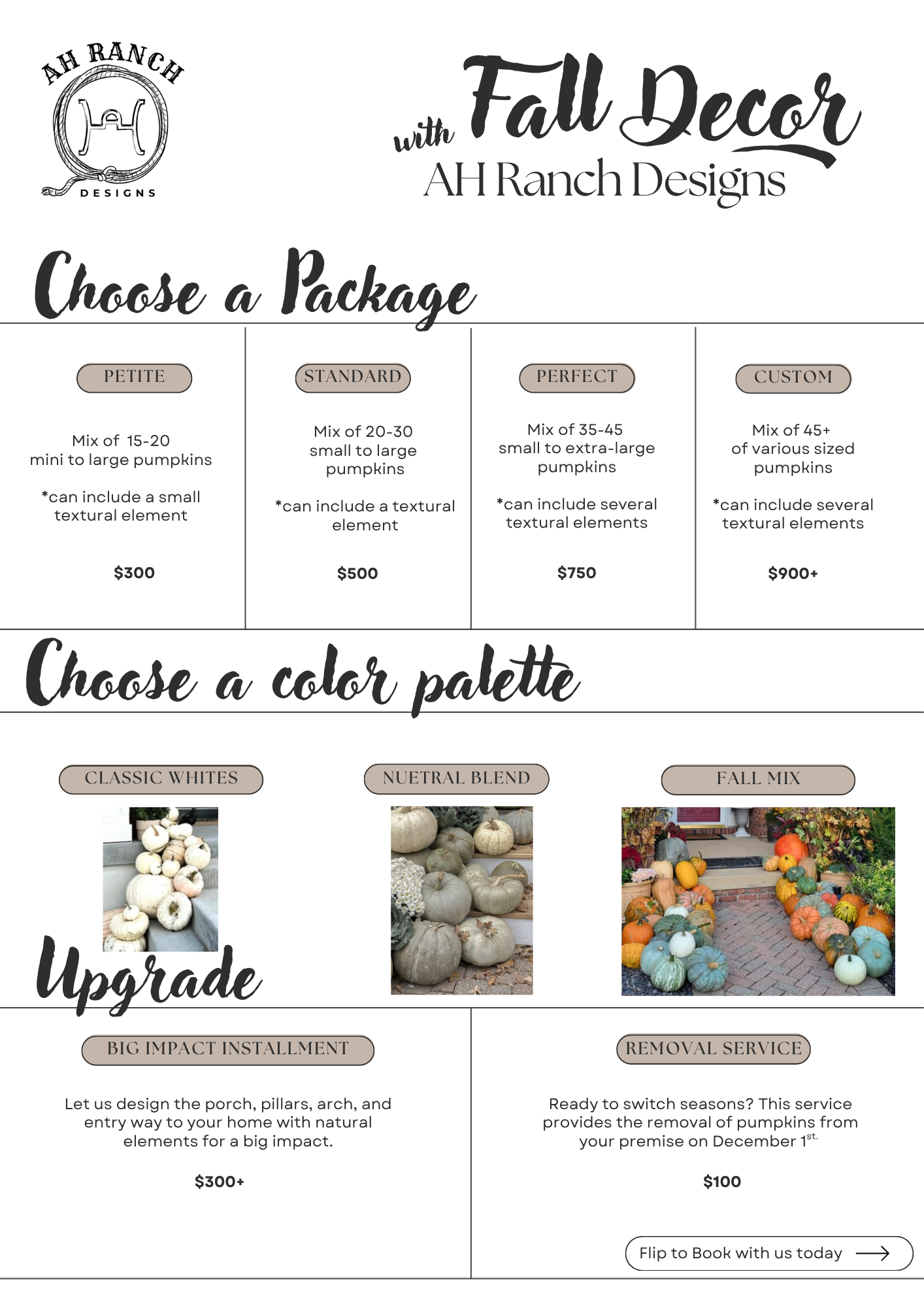Contact us on social media, send us an email at ahranchdesigns@gmail.com, or text (309)877-2934 to book your pumpkin package!